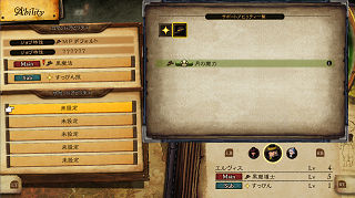 サポートアビリティ一覧の上部にあるアイコンは、ジョブを表します。左側のアイコンがすっぴん、右側のアイコンが黒魔道士。そして、そのジョブの習得しているサポートアビリティが下部に一覧として表示されます。サポートアビリティをひとつも習得していない場合は、何も表示されません。