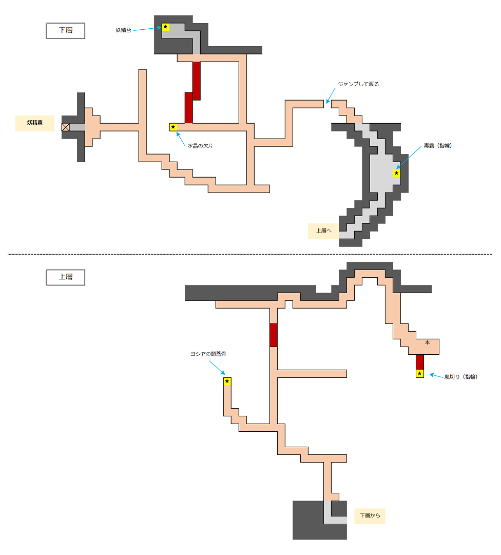 妖精森の地下と比べて森林樹冠は足場が悪いため、敵の攻撃よりも足場を踏み外しての落下死の方が怖い。