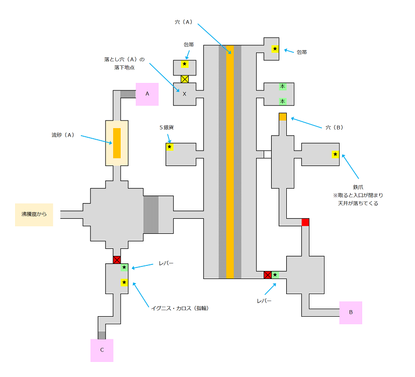 1F東部の部屋で鉄爪を取ると、入口が閉まり、落ちてきた天井に潰されて圧死する。