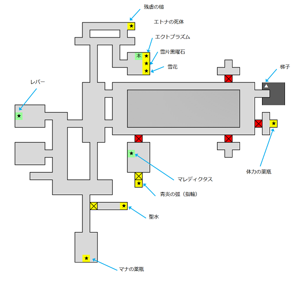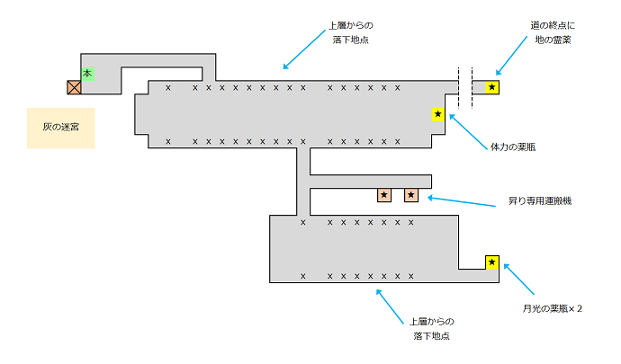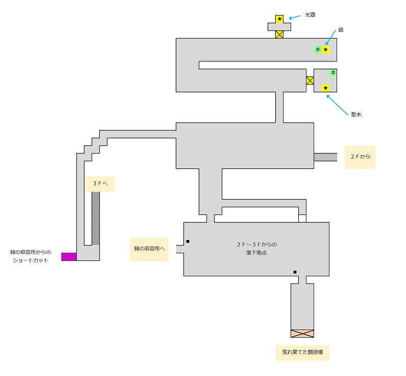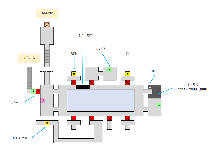 2階へ行くためには、3階北部の通路の切れ間から落ちるか、もしくは1階まで落下した後に2階へ上がる。