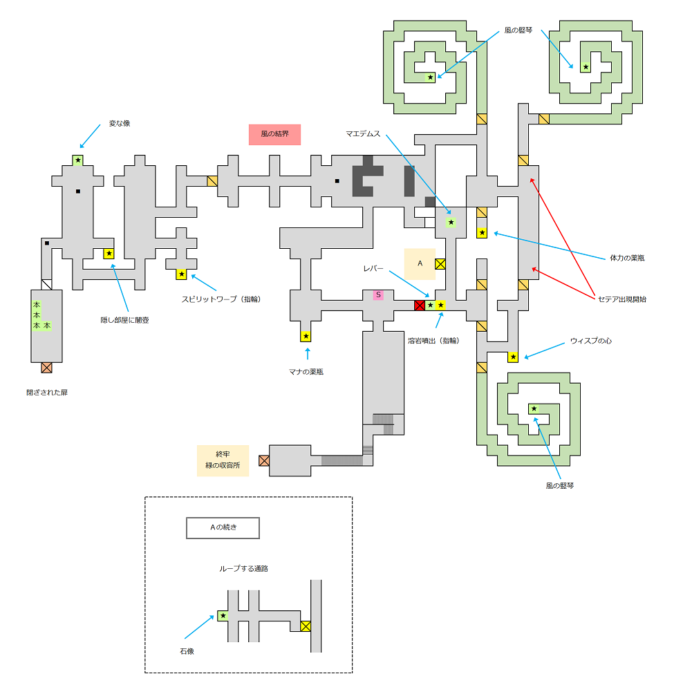 マエデムスがいる場所に通じる通路に隠し扉がある。その隠し扉の先に進むと1体の像が設置されており、像には「NNSNSSNSNN」の文字がうっすらと浮かんでいる。