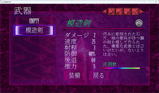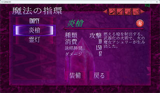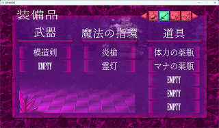 武器、魔法(魔法の指輪)、道具は、この画面から装備しないと使用できない。武器と魔法は2つまで、道具は5つまで装備可能。