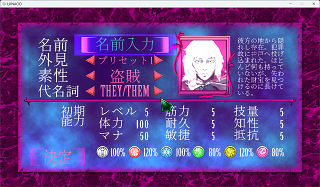 この中で需要な要素が素性。選んだ素性によって初期能力値、属性耐性、特性が決まります。